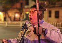На фото: вечером 17 декабря на оживленной улице в городе Наньчан провинции Цзянси ?музыкальный гений?, мальчик Вэй Цзюнь, болеющий аутизмом, с радостью поет.