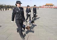 На снимке: Милиционеры с собаками патрулируют на площадь Тяньаньмэнь.