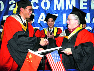 С каждым годом увеличивается международное сотрудничество и обмен в области образования. Китай является страной, направляющей самое большое количество учащихся на учебу за границу. С 1979 г. на учебу за рубеж в 103 страны и района мира выехало 582 тыс. человек, из них 160 тыс. человек после окончания учебы вернулись обратно; наряду с этим быстро растет количество иностранных учащихся, приезжающих на учебу в Китай, всего лишь в 2003 г. в вузах Китая обучается 86 тыс. иностранных студентов из 170 стран мира.