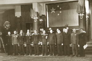 На снимке: 16 октября первый посол СССР в КНР Рощин Н. В. (шестой справа в первом ряду) – вручает Мао Цзэдуну верительные грамоты.