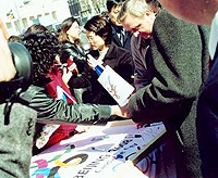 На площади Революции москвичи ставят свои подписи под заявлением в поддержку кандидатуры Пекина в конкурсе на право устроения Олимпийских игр 2008 года.