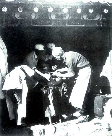 Канадский врач Н. Бетьюн оперирует раненого солдата 8-й армии.