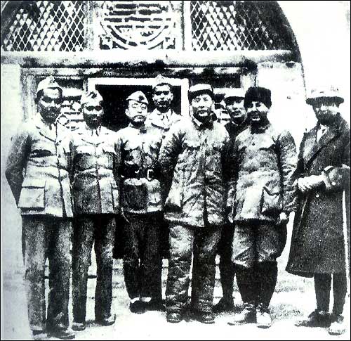 Мао Цзэдун с членами индийской Миссии помощи Китаю в Яньани, 15 марта 1939 года: Мао Цзэдун (пятый слева), Б.К. Басу (первый слева), Д.С. Котнис (второй слева), Д. Мукерджи (четвертый слева), М. Атал (седьмой слева) и М. Чолкар (восьмой слева).