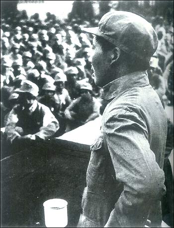 Председатель Реввоенсовета ЦК КПК Мао Цзэдун выступает с речью ?О затяжной войне? в Антияпонском военно-политическом университете в Яньани в 1938 году.