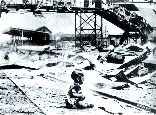 Во время японской бомбардировки южного вокзала Шанхая погибло более 200 чел., огромное количество людей было ранено. На фотографии, получившей печальную известность, - плачущий ребенок.