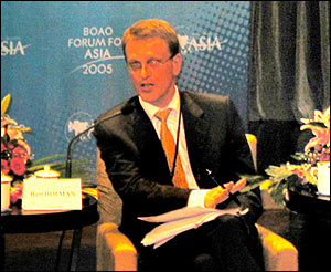 22 апреля генеральный секретарь Боаоского азиатского форума Лун Юнту, председатель правления Боаоского азиатского форуму, вице-президента Филиппин Ф. Рамоса и первый высококвалифицированный экономист Всемирного банка в Пекине Bert Hofman обсуждали соответствующие вопросы в рамках Боаоского азиатского форума 2005.