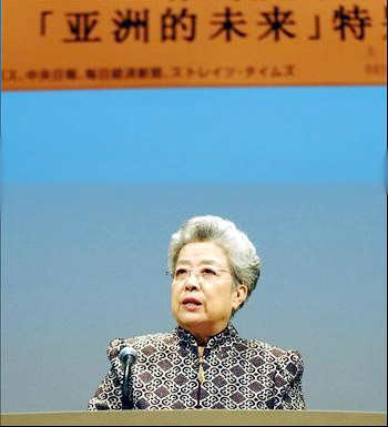 Она указала, что Азия является общей географической основой для стремления Китая и Японии к дальнейшему развитию и прочному процветанию. Сотрудничество между странами -- необходимые условия для мира, стабильности и развития Азии. Мирное сосуществование, дружба из поколения в поколение, взаимовыгодное сотрудничество и общее развитие Китая и Японии отвечают дальнейшим коренным интересам обеих сторон и общим стремлениям всех стран Азии. Китай и Япония должны активно и инициативно приспособлять себя к развитию и изменениям времени и приложить совместные усилия для продвижения регионального сотрудничества, чтобы Азия еще активнее противостояла конкуренции и вызовам экономической глобализации, таким образом можно будет достичь общего развития в историческом процессе процветания Азии. Это является призывом времени, неизбежностью истории, непреложной ответственностью обеих стран и серьезным испытанием храбрости и мудрости правительств и народов стран.