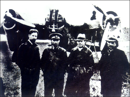 Советский авиатехник Камонин (первый слева) и переводчик Лебедев (второй справа) на ханькоуском аэродроме.