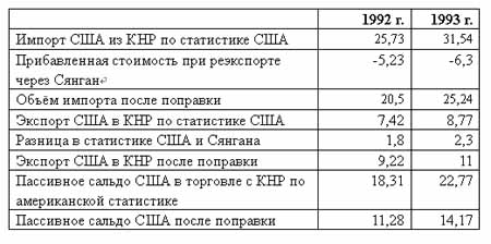Но даже если не учитывать ошибок, привнесенных неадекватной классификацией места происхождения товара, только по причине начисления прибавленной стоимости при реэкспорте показатели пассивного сальдо в торговле с Китаем, опубликованные американской стороной, оказались завышенными на 7 млрд. долларов (1992) и на 8,6 млрд. долларов(1993), или ежегодно на 60 процентов в среднем (см. таблицу 2).