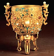 Стакан "Цзиньоу-юнгу". Высота 12,5 см, диаметр 8 см, выполнен в конической форме. На его поверхности 10 крупных жемчужин. По бокам - ушки в форме драконов, головы которых также украшают большие жемчужины. У стакана три ножки, в форме хобота слона. Ножки опутаны золотыми нитями и инкрустированы слоновой костью. Стенки стакана покрыты узорчатой резьбой, на одной стороне - выпуклые письмена "Цзиньоу-Юнгу", на другой - надпись "Сделан в годы правления императора Цяньлуна". "Цзиньоу-Юнгу" означает устойчивую власть и долгое правление императоров династии Цин (1644 – 1911 гг).