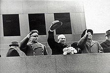 Председатель Народного Правительства КНР Мао Дзэдун, Первый секретарь ЦК КПСС Н. С. Хрущев и Р. Малиновский на трибуне Мавзолея.